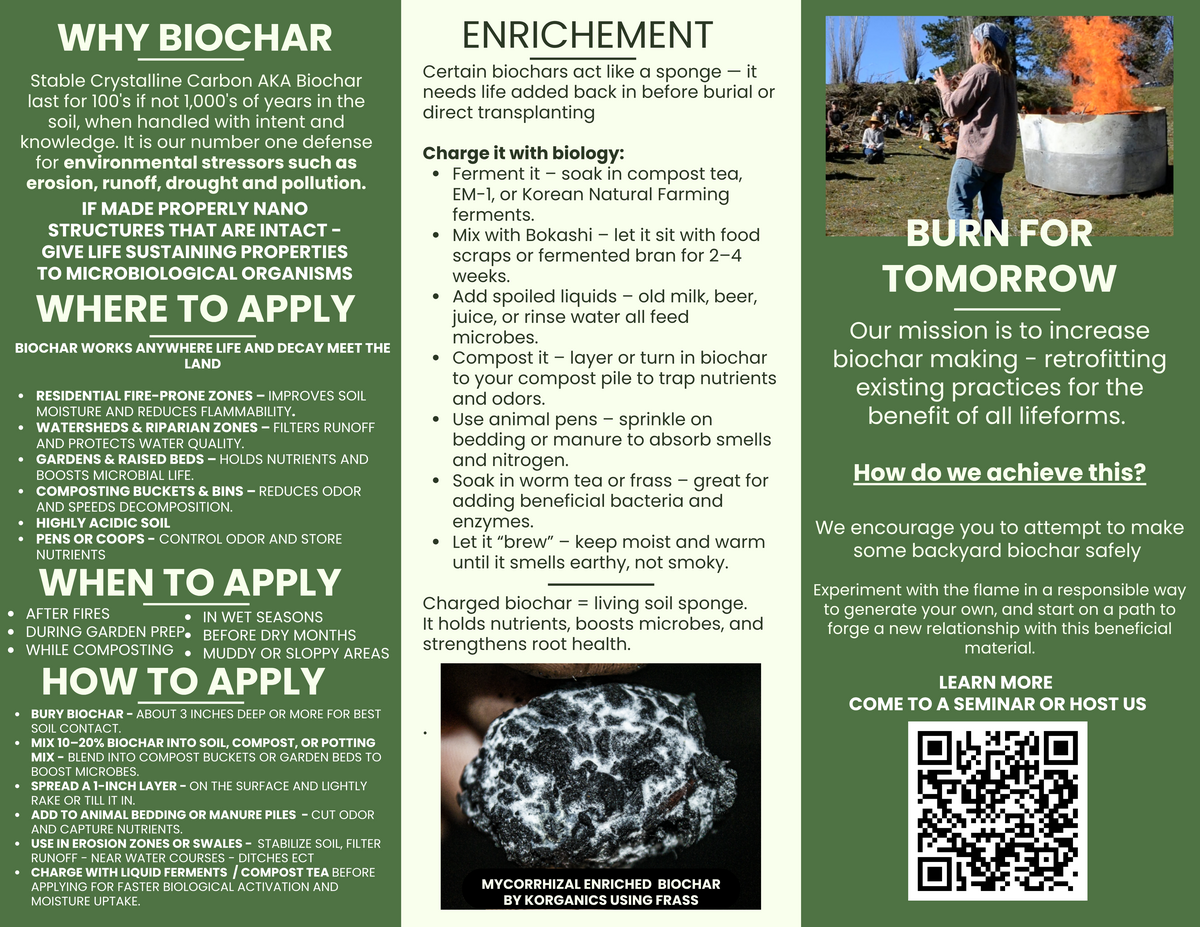 An open above ground fire can increase the amount of BioChar by simply lighting a full pile from the top and watching it burn down engulfing BioMass until the flames are gone and a pile of red hot coals remain developing a thin layer of grey ash, then apply as much water as needed to fully quench to cold black BioChar. Rake out the pile of char as you quench to assure they are fully out & to avoid them reigniting from any residual heat. Now you have clean empty stable Carbon BioChar ready for enriched inoculation. If water is not abundant or available the coals can be smothered with dirt.